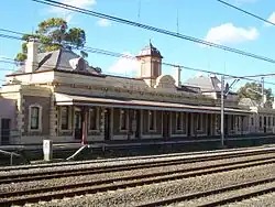 The "first class station building" is a symmetrical composition in an ornate Italianate style with a high parapeted central block, a central tower, and flanked by lower supporting buildings. The main block is fronted to the south by a platform awning supported by cast iron columns with decorative cast iron lace work. The width of this platform has been reduced since it was decommissioned. The Terminus Street elevation is accessed via sandstone steps onto a veranda, supported on cast iron columns with decorative lacework, which spans the extent of the central block. An access door under this veranda has been created off the lower landing of the stone steps to the west. The exterior walls are face brickwork with painted moulded cement decorative elements. To the eastern end of the original building is a rendered brick extension. Infill sections have been constructed between the previously separate wings to the east and west and 2 garage doors under the eastern wing (there was previously a garage door located further to the east which has subsequently been bricked up).[3]
