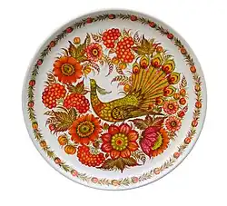 Petrykivka painting is traditionally dominated by plant forms, particularly of flowers. At times, they are depicted as abstracted shapes that do not necessarily correspond to any recognizable, naturally occurring plant species. In other cases, they are based on common garden flowers (e.g. dahlias, asters, tulips, roses), wildflowers (e.g. camomile, cornflower), and other plants (such as vibernum berries, strawberries, and grapes). Acanthus leaves (traditionally referred to as "ferns") and flower buds are also commonly seen. The plant imagery is often combined with birds, and sometimes with images of animals and people, which are often depicted in somewhat fanciful form. Designs also commonly make use of the image of a phoenix or firebird.[22] Historically, Petrykivka painting was done exclusively on white backgrounds (either whitewashed walls or on white paper), but contemporary artists have used backgrounds of a variety of colors, including black, blue, green, and red.