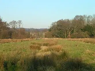 The wharf at Haslingbourne has entirely disappeared and an electricity sub-station and a former water treatment plant, which pumped water from springs at the foot of Gore Hill to Petworth, are on the site. The area is now used for storage of construction machinery. Below Haslingbourne Cottages the stream flows in the canal bed which is cut through sandstone beds, creating a shaded artificial gorge rich in mosses and lichens. Emerging from this cutting at the site of Upper Lock the canal follows a straight course across low lying boggy ground, fenced off as a nature reserve area. Reaching the site of Haines Lock the stream can be heard pouring through a broken down weir in the undergrowth as it turns eastward into its natural course. The west bank of the canal here runs into the pasture for some twenty metres and the position of the levelled course beyond can just be discerned. Beyond the slightly higher ground here, as the Haslingbourne Stream again comes close to the canal, the embankments can be seen forming a straight line across the floodplain to the river. A pond near the river is the site of a weir and tumblebay.