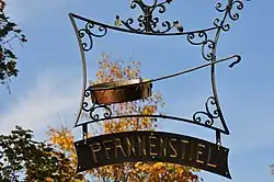 On the origin of the name Pfannenstiel remembers the plate (Inn sign) of the Vorderer Pfannenstiel restaurant: A pan containing pitch used to send smoke signals. In the 17th century or much earlier, the government of the city of Zürich established a system of Hochwachten to warn, in cases of emergency as threat of war, the neighboring Hochwachten on the Albis, near Forch, on Zürichberg, Käferberg, Bachtel, Uetliberg, and so on, by fire and smoke. The Pfannenstiel Hochwacht was located on the summit called Okenshöhe as from there numerous other Hochwachten were in direct sight. For the same reason, in 19th century Okenhöhe was uses for a triangulation point as other triangulation points can be measured. These measurements form the backbone of the national geographical survey. Nevertheless, the pan with the fire as sign of "bad luck" it's not the real origin of the term Pfannenstiel: It was first mentioned in documents of the year 1333, and it is assumed that the term points to a meadow and farmland nearby forming a panhandle.[3]