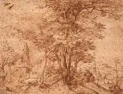 Although Bruegel presumably made them, no drawings that are clearly preparatory studies for paintings survive. Most surviving drawings are finished designs for prints, or landscape drawings that are fairly finished. After a considerable purge of attributions in recent decades, led by Hans Mielke,[13] sixty-one sheets of drawings are now generally agreed to be by Bruegel.[42] A new "Master of the Mountain Landscapes" has emerged from the carnage. Mielke's key observation was that the lily watermark on the paper of several sheets was only found from around 1580 onwards, which led to the rapid acceptance of his proposal.[43] Another group of about twenty-five pen drawings of landscapes, many signed and dated as by Bruegel, are now given to Jacob Savery, probably from the decade of so before his death in 1603. A giveaway was that two drawings including the walls of Amsterdam were dated 1563 but included elements only built in the 1590s. This group appears to have been made as deliberate forgeries.[44]