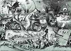 Among his greatest successes were a series of allegories, among several designs adopting many of the very individual mannerisms of his compatriot Hieronymus Bosch: The Seven Deadly Sins and The Virtues. The sinners are grotesque and unidentifiable while the allegories of virtue often wear odd headgear.[37] That imitations of Bosch sold well is demonstrated by his drawing Big Fish Eat Little Fish (now Albertina), which Bruegel signed but Cock shamelessly attributed to Bosch in the print version.[20]