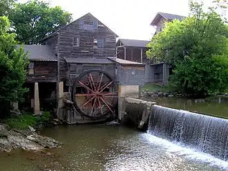 The Pigeon Forge Mill, commonly called the Old Mill, is a historic gristmill in the U.S. city of Pigeon Forge, Tennessee. Located along the West Fork of the Little Pigeon River, the mill complex currently consists of a millhouse, breastshot wheel, and milldam, all of which are operative.[1] The mill is the only structure in Pigeon Forge listed on the National Register of Historic Places.