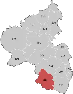 Pirmasens is an electoral constituency (German: Wahlkreis) represented in the Bundestag. It elects one member via first-past-the-post voting. Under the current constituency numbering system, it is designated as constituency 209. It is located in southern Rhineland-Palatinate, comprising the cities of Pirmasens and Zweibrücken, the Südwestpfalz district, and the southwestern part of the Landkreis Kaiserslautern district.[1]