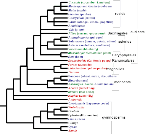 Since the past few years, researchers have indeed begun looking at non-model, "non-conventional" organisms using modern genetic tools. One example of this is the Floral Genome Project, which envisages to study the evolution of the current patterns in the genetic architecture of the flower through comparative genetic analyses, with a focus on EST sequences.[30] Like the FGP, there are several such ongoing projects that aim to find out conserved and diverse patterns in evolution of the plant shape. Expressed sequence tag (EST) sequences of quite a few non-model plants like sugarcane, apple, barley, cycas, coffee, to name a few, are available freely online.[31] The Cycad Genomics Project,[32] for example, aims to understand the differences in structure and function of genes between gymnosperms and angiosperms through sampling in the order Cycadales. In the process, it intends to make available information for the study of evolution of seeds, cones and evolution of life cycle patterns. Presently the most important sequenced genomes from an evo-devo point of view include those of A. thaliana (a flowering plant), poplar (a woody plant), Physcomitrella patens (a bryophyte), Maize (extensive genetic information), and Chlamydomonas reinhardtii (a green alga). The impact of such a vast amount of information on understanding common underlying developmental mechanisms can easily be realised.