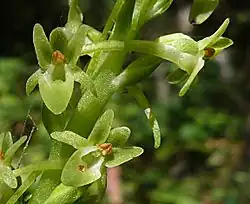 Platanthera michaelii is an uncommon species of orchid known by the common names Michael's rein orchid and Michael's piperia. It is endemic to California, where it is known from the coastal plains, hills, and mountains, and the Sierra Nevada foothills. It can be found in varied habitats, including scrub, woodland, and forest. This orchid grows erect to about 70 centimeters in maximum height from a bulbous caudex. The basal leaves are up to 24 centimeters long by 5 wide. Leaves higher on the stem are much reduced. The upper part of the stem is a spikelike inflorescence of many yellow-green flowers which are fragrant in the evenings.