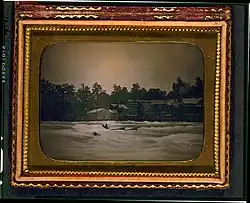 Babbitt photographed Joseph Avery on July 17, 1853 holding onto a log in the rapids above the falls. Avery was one of three men who lost their boat in the current. As the boat capsized, two of the men went over the falls and died, but Avery was able to hold onto a log pinned amongst rocks for 18 hours before succumbing after a series of failed rescue attempts.[3]