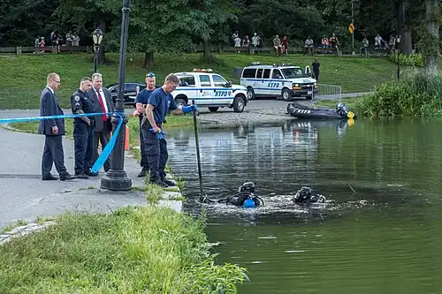 NYPD divers removing material from the Harlem Meer following a murder in the area few days prior.Police divers in a river in Berlin