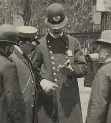 The navy blue uniforms adopted by many police departments in this early period were simply surplus United States Army uniforms from the Civil War.[4] Headwear typically took the form of stovepipe hats, a starched woolen head cover similar in appearance to a top hat but with a squatter dimension, or British-style custodian helmets. In rural areas, where preventative policing was limited or non-existent, sheriff's deputies continued to wear civilian attire, using only their badge as a mark of identification. In many states this practice continued well into the following century. The Orange County, California, sheriff's office, for instance, did not adopt a uniform until 1938.[5]
