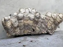 Polistes nests can be built from wood fiber which are collected from posts and plant stems. The fiber is formed into a paper-like comb with hexagonal cells. The nests are orientated downward and are held up by one filament.[14] P. exclamans have also been observed occupying artificial nests put out by researchers and consisting of bundles of straws.[12]