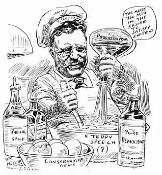 In 1910, Roosevelt embodied his strong belief in social justice in his proposals for a "New Nationalism."[12] He believed that human welfare was more important than property rights. He insisted that only a powerful federal government could regulate the economy and guarantee justice, and that a president can succeed in making his economic agenda successful only if he makes the protection of human welfare his highest priority. In terms of politics, his ideas were eagerly endorsed by progressives in the West, and denounced by conservative Republicans in the East. This was frustrating to Roosevelt who realized the Republican Party must unite in order to win the presidency.[13]