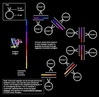 6. ^ Here, intact implies that the undigested protein is recognized, and not that the paratope on B cell receptor comes in contact with the whole protein structure at the same time; the paratope will still contact only a restricted portion of the antigen exposed on its surface.