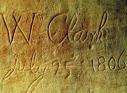 The inscription consists of his signature and the date, July 25, 1806.[3] Clark wrote that he climbed the sandstone pillar and "had a most extensive view in every direction on the Northerly Side of the river". He named the outcropping after Jean Baptiste Charbonneau—the son of expedition member Sacagawea—whom he nicknamed "Pompey". His original name for it was "Pompey's Tower"; it was given the current name in 1814.