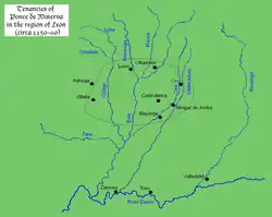Ponce acquired a vast wealth in lands after his migration to León. His principal estates all lay within fifty kilometres of the urbs regia of León, which he himself governed from 1148 to 1165 and again from 1167 to 1168. He had many estates in the valleys of the rivers Esla, Porma, Órbigo, and Bernesga.[47] Besides properties he received from Alfonso VII and Ferdinand II, which was a total of ten donations between 1148 and 1174, Ponce and Estefanía acquired lands at Mayorga on the Esla, and at Quintanilla and Villalba de Loma on the Porma.[73]