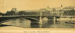 Begun in 1831 in the prolongation of the rue des Saints-Pères[1] on the Left Bank, the original bridge was known under that name until its inauguration, in 1834, when king Louis-Philippe named it Pont du Carrousel, because it opened on the Right Bank river frontage of the Palais du Louvre near the Arc de Triomphe du Carrousel in front of the Tuileries.