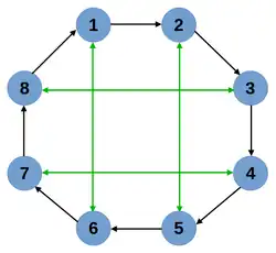- Neighbourhood relations between islands: they determine which islands are considered neighbouring and can thus exchange individuals, see picture of a simple unidirectional ring (black arrows) and its extension by additional bidirectional neighbourhood relations (additional green arrows)
