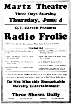 Carrell commonly used his portable stations, in conjunction with local small-town theaters, to broadcast entertainment programs featuring radio personalities from major cities. A May 1925 Logansport, Indiana event, broadcast by Carrell's WHBL, was advertised as: "Starting Sunday, May 24, 4 days, C. L. Carrell Brings to Logansport a New Radio Frolic. All New Radio Stars in a New Musical Review with a Broadcasting Station In Actual Operation on the Luna Stage".[22] A February 1926 advertisement for WBBZ's visit to Manitowoc, Wisconsin invited the curious to: "Come See---Hear, and be taken into the mysteries of radio broadcasting".[23] Over time Carrell's stations began staying in individual communities for longer periods of time, and included local entertainers, in part to judge whether establishing a permanent station was financially viable.