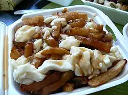 | Poutine | | Quebec, Canada | A common Canadian dish, originating in Quebec, made with french fries, topped with a light brown gravy-like sauce and cheese curds.[42] |