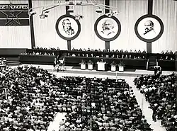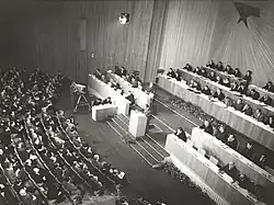 According to Ranković, the statute adopted by the 5th Congress in 1948, "was by and large a copy of the Statute of the Soviet Communist Party".[10] As a result of the Tito–Stalin split, a conflict in which the Soviet political leadership accused the Yugoslav communists of breaking with communism, the LCY began questioning the Soviet model and its suitability for Yugoslavia.[11] The LCY began to stealthily move towards more democracy and the decentralisation of socio-political life.[12] This trend was first confirmed at the 5th Session of the Central Committee of the 5th Congress on 27 May 1952, and later that year at the 6th Congress, which was held from 3 to 7 November.[13] The congress changed the party's name from Communist Party of Yugoslavia to League of Communists of Yugoslavia; according to Tito: "in view of the fact that the role of the Party at this stage of our social development changed to a certain extent ... the word Party is no longer adequate".[14] It was argued designating the LCY as the leading force in society was wrong and accordingly, the 6th Congress stated instead the party "mobilises and moves the broadest masses of the people to action by political and organisational means, so that its struggle and achievements make it a leader".[14] These changes did not affect the LCY's internal organisation or democratic centralism. The Politburo's name was changed to the Executive Committee and the Secretariat was made responsible to it rather than to the Central Committee.[15]