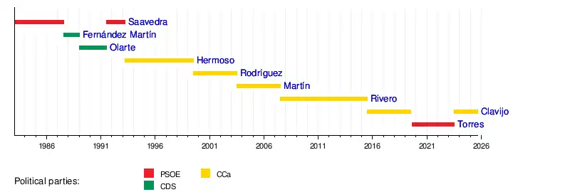 | Jerónimo Saavedra (1936–2023) | 13 January 1983 | 10 June 1983 | 4 years and 202 days | PSOE | Saavedra I PSOE | N/A | King Juan Carlos I ![]() (1975–2014) | [1] [2] [3] [4] | |