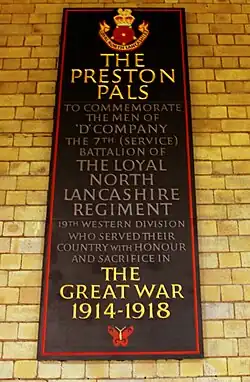 A free buffet for servicemen was provided at the station during both World Wars. The Preston Station Free Buffet Association served free hot drinks, biscuits and buns and sold sandwiches at cost price to anyone in uniform 24 hours a day for the duration of the First World War. Four hundred women working 12-hour shifts served over 3 million men between 1915 and 1919. 12 million cups of tea were served between 1939 and 1945.[35] It was funded by subscription and had its own marked crockery. The station was on a major north–south route for troops. There are three commemorative plaques related to the First World War buffet in the waiting room on platforms 3 and 4, the former site of WWI buffet. One of the drama segments of the televised Preston Passion of 2012 was set in the First World War servicemen's buffet. The Second World War buffet was located in the southern building further down platforms 5&6 (now platforms 3&4).