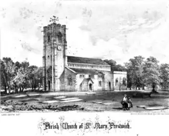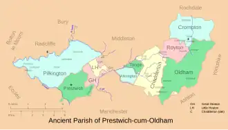 Prestwich-cum-Oldham (also known as Prestwich with Oldham)[1][2] was an ancient ecclesiastical parish of the hundred of Salford, within the historic county boundaries of Lancashire, England. With the Parish Church of St Mary the Virgin, Prestwich as its centre, this parish encompassed a total of ten townships,[2] and within them, several smaller chapelries.