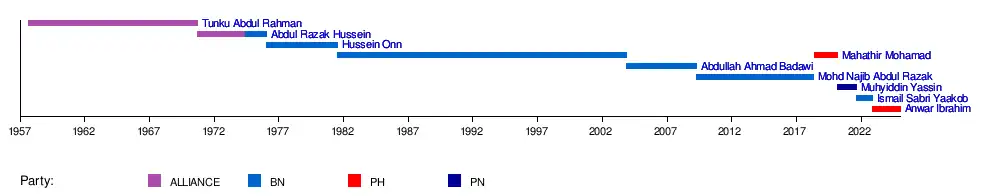 - ^ Elected in the 1955 Malayan general election for the position of chief minister on 27 July 1955 but it was renamed prime minister when Malaya gained independence from the United Kingdom on 31 August 1957, although it may not be considered a full term given that the election did not elect the prime minister, it is still considered a full term for the prime minister unless his term as chief minister is involved.