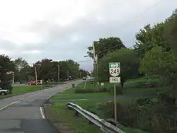 Just north of the roundabout, the route intersects with the eastern terminus of Route 235 (Kingston Road). After Route 235, Route 248 crosses northwest into the town of Warren Grove, where it becomes North York River Road, a two-lane rural road. Paralleling the North River, Route 248 bends northward into a fork with the terminus of Route 225. North of Route 225, Route 248 continues north, no longer designated a collector highway,[2] through the town of Warren Grove, soon crossing into the village of Miltonvale Park. Retaining the North York River Road moniker, Route 248 reaches the shores of the North River, crossing between the river and numerous residences on the southbound lanes.[1]
