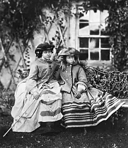 Alice was considered to be one of the most beautiful of Queen Victoria's daughters. When she was a year old, her father mentioned her as 'the beauty of the family.'[11] While her sister Vicky was convinced that Alice was a beauty and had sent her mother a picture of the two of them with their babies in the autumn of 1864 with the comment, "the ugly sister & the pretty one (the 1st of course myself)." Vicky's father-in-law preferred Alice for her beauty, as her sister said, he was never "so amiably disposed" toward her as when her prettier sister was around.[12] In her childhood, Alice formed a close relationship with her brother, the Prince of Wales, and her eldest sister, The Princess Royal. Victoria's marriage to Prince Frederick William of Prussia in 1858 greatly upset her.[13]