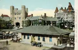 The original 1865 location of Princeton station, in what became the university's Blair Courtyard, 0.15 mi (0.24 km) south of Nassau Street, was replaced by the 1918 station, built on a site 0.25 mi (0.40 km) further south.[22][23] The historic 1918 station was constructed when the branch was part of the Pennsylvania Railroad (PRR) under the direction of architect-engineer Alexander C. Shand, who had also overseen construction of the now-demolished Philadelphia Broad Street Station. Designed in the Collegiate Gothic style, the 1918 Princeton station contained a stone station house, a stone freight house, and a canopy-covered platform.[23] The station has been owned by several different parties since the PRR era: Penn Central (1968–1976), Conrail (1976–June 1984), New Jersey Department of Transportation, New Jersey Transit Rail Operations (to October 1984), and Princeton University.[24][25] It was listed on the New Jersey Register of Historic Places[26] and the National Register of Historic Places[6] in 1984 as part of the Operating Passenger Railroad Stations Thematic Resource.[27][a]