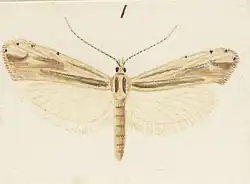 โ. 34 mm. Head ochreous-whitish, sides of crown dark brown, hairs projecting on forehead. Palpi ochreous-whitish, second joint brownish-ochreous except apical edge, tuft long, rough, terminal joint much shorter than second. Antennae whitish-ochreous, ciliation 1 , basal joint dark brown, without flap of scales. Thorax brown, with broad ochreous-whitish dorsal stripe and dark- fuscous stripe on each side of it. Abdomen whitish-grey-ochreous. Forewings elongate, rather narrow, posteriorly slightly dilated, costa gently arched, apex obtuse, termen nearly straight, rather oblique ; pale brownish-ochreous, more brownish-tinged in disc and towards dorsum, obscurely streaked with ochreous-whitish suffusion between veins ; a narrow ochreous-white dorsal streak from base to 2โ3, edged above with dark-fuscous suffusion anteriorly ; an irregular brownish median longitudinal streak from middle of disc to termen, with some blackish scales in longitudinal lines ; some dark-brown dots round posterior part of costa and termen : cilia light-brownish, at apex and on costa ochreous-whitish. Hindwings with 3 and 4 approximated at base ; ochreous - grey - whitish : cilia concolorous.[3]