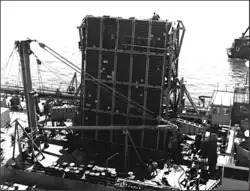 The World War II tanker Mission Capistrano was selected and modified for deploying the array. The T2 tanker hull had sufficient space and structural integrity to allow installing array power and control systems and creating a large center well through which the array could be housed, lowered and operated.[18][41] On 28 August 1958 specifications for conversion were completed with a contract for conversion with Avondale Marine Ways let on 7 January 1960. The ship engaged in array tests and was further modified until 3 November 1962 when the array was removed at Philadelphia Naval Shipyard and the ship released for other work until re-installation the next March.[34]