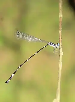 It is a large slender damselfly with black capped ultramarine blue eyes. Its prothorax is blue with posterior lobe black. Its thorax is glossy black, marked with two narrow blue lateral stripes on each side. There is a similar stripe on the posterior part of metepimeron. Abdomen is black, marked with white and blue. Sides of segment 1 is blue; 2 is white. Segment 3 is with a narrow basal annule. Segments 4 to 7 are with broad basal annules. Segment 8 is with its basal half turquoise-blue, extending along sides nearly as far as apex, and separated from the base of segment by a very narrow black basal ring. Segments 9 and 10 are unmarked. Anal appendages are black. Female is very similar to the male, but shorter and more robustly built.[2]