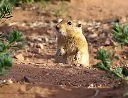 Fat sand rats dig burrows with multiple entrances directly under plants they consume, primarily selecting burrowing sites based on the abundance of Amaranthaceae shrubs in the area over any other factor such as cover.[4][15] As such, their preferred type of habitat, and the distribution of fat sand rats in a particular habitat changes throughout the year in response to the different growing season of plants in the wadi beds or terraces that they inhabit.[16] Wadi beds are typically populated with Amaranthaceae shrubs, and have dense vegetative cover, while terraces are very sparsely vegetated, leaving the habitat exposed.[11] Distribution of the fat sand rat in a particular habitat is also influenced by the abundance of rainfall in the area, as well as the population density of the site from the previous season.[17] During the winter, fat sand rats prefer the wadi habitat as a result of the vegetative growth during this time, but after a wet autumn, more individuals will burrow in a terrace habitat even when population density is low, as opposed to after a dry autumn, when individuals only burrow in terrace habitats when the population density is high.[16]