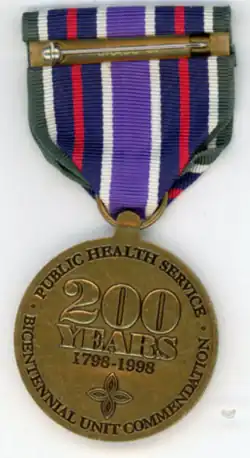 The PHS Bicentennial Unit Commendation Award recognizes service during the bicentennial of the founding of the U.S. Public Health Service,[2][3] which the service traces to the creation of the United States Marine Hospital Service in 1798.[4] Any USPHS Commissioned Corps officer who served satisfactorily on active duty for any period between 1 January 1998 and 16 July 1999 qualifies for the award.[2]