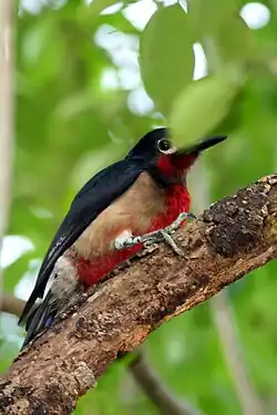 The Puerto Rican woodpecker has a black body and a bright red throat and breast. It has a white patch that runs across the head from eye to eye. Its flanks and lower body have a light tangerine coloration. As with the majority of birds sexual dimorphism is present in this species. The males' throat and breast are more brightly colored than the females' with females tending to be all-around duller in coloration. There is also a substantial (~18%) difference in bill length between sexes.[2]