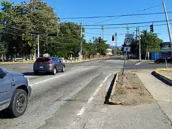 As the road makes its way through the city of Ponce, it is also known as the Ponce Bypass.[8] The Ponce Bypass intersects with seven major roads: PR-2R (Carretera Pámpanos), with access to the Estadio Francisco Montaner; PR-585 (Avenida Eduardo Ruberté), which leads to barrio Playa; PR-123 (Avenida Hostos), leading to the Museo de Arte de Ponce and historic downtown Ponce; PR-12 (Avenida Santiago de los Caballeros), leading to La Guancha Boardwalk and the Port of the Americas; and PR-163 (Avenida Julio Enrique Monagas) leading to Julio Enrique Monagas Family Park and Museo de Arte de Ponce. The road's last intersection in Ponce as well as its western terminus is at its intersection with PR-133 westbound (Calle Comercio, a.k.a. Avenida Ednita Nazario) and PR-1 eastbound (Avenida La Ceiba). PR-133 heads west to Ceiba Tree Park and PR-1 heads east to Mercedita Airport. After this dual intersection at PR-133/PR-1 the road seamlessly becomes a 4-lane thoroughfare called Miguel A. Pou Boulevard, the city's main artery into the Ponce Historic Zone.