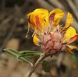 Pultenaea capitellata is a sprawling to prostrate shrub with hairy stems up to 50 cm (20 in) long. The leaves are elliptic to broadly egg-shaped with the narrower end towards the base, 3–12 mm (0.12–0.47 in) long and 2–5 mm (0.079–0.197 in) wide with stipules 1–3 mm (0.039–0.118 in) long at the base. The edges of the leaves are turned down or rolled under and the lower surface is paler than the upper. The flowers are borne in dense clusters near the ends of branchlets with hairy, overlapping, three-lobed bracts. The sepals are 5–7 mm (0.20–0.28 in) long with pale-coloured, silky hairs and linear bracteoles 2–3.5 mm (0.079–0.138 in) long at the base. The standard petal is 7–8 mm (0.28–0.31 in) long and yellow to orange with reddish markings, the wings are yellow to orange and the keel is red to purple. Flowering occurs from November to January and the fruit is a flat pod about 6 mm (0.24 in) long surrounded by the remains of the sepals.[2][3][4]