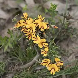 Twiggy push-pea grows in forest, woodland and mallee in Victoria, New South Wales and South Australia. It is most common in central Victoria, and occurs in the west of New South Wales, south from West Wyalong and in the south-east of South Australia.[2][3][4]