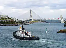 Pyrmont is linked to the city by the Pyrmont Bridge, a swing bridge for pedestrians and cyclists. The Western Distributor passes through the suburb and provides a connection to the city and then to the North Shore via the Sydney Harbour Bridge. The Distributor includes the Anzac Bridge, a large cable-stayed bridge spanning Johnstons Bay between Pyrmont and Rozelle, which replaced the Glebe Island Bridge.