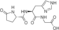 - ^ Bauce, Lorenzo G.; Elliott, Crystal; Hughes, Rhiannon; Goren, H. Joseph (1 January 1981). "Synthesis and assay for activity of a proposed anorexogenic agent, L -pyroglutamyl- L -histidyl-glycine". Canadian Journal of Physiology and Pharmacology. 59 (1): 88–90. doi:10.1139/y81-015. PMID 7214215.