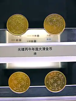 These denominations were not produced in large numbers as the Qing dynasty would be overthrown by the Xinhai revolution only a year later.[32] By the end of the Qing dynasty the government's attempts at modernising the monetary system had failed and machined coins circulated alongside traditional coinages, this situation would continue under the Republic of China.[14]