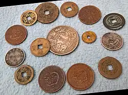 During the Qing dynasty period, the Chinese monetary system was a bimetallic system where both copper-alloy cash coins and silver circulated simultaneously.[15] The copper-alloy currency during most of the Qing dynasty period consisted solely of cash coins with a denomination of 1 wén, which could be strung together into strings of 1,000 cash coins for larger payments.[15] While strings officially consisted of 1,000 cash coins, normally it would contain only around 980 copper-alloy cash coins.[33][15]