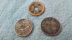 The new coins often bore the inscription Guāng Xù Yuán Bǎo (光緒元寶) with an image of a Dragon and featured English, Chinese, and Manchu inscriptions. Further these coins tended to have their relation with China's older coinages (most often with cash coins) on the bottom, or their value in relation to silver coinage, and the Manchu words indicated the place of mintage.[14] Meanwhile, the 10 wén "traditional" cash coins were discontinued as the production of these more modern coins began.[31]