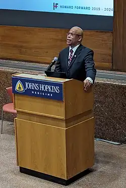![]() Dr. Quinn Capers IV, Professor and Chair of the Department of Medicine at Howard University College of Medicine, speaking at Johns Hopkins Hospital Medical Grand Rounds on 26 April 2024, standing at the lectern in historic Hurd Hall | |