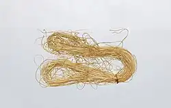 Regardless of the animal, Inuit traditionally used as much of the carcass as possible. Every portion of the hide had a specific use depending on its characteristics.[98] Tendons and other membranes were used to make durable fibres, called sinew thread or ivalu, for sewing clothing together. Feathers were used for decoration. Rigid parts like bones, beaks, teeth, claws, and antlers were carved into tools or decorative items.[93] The soft material shed from antlers, known as velvet, was used for tying back hair.[93] Intestine from seals and walruses was used to make waterproof jackets for inclement weather.[20] The Russian word kamleika is sometimes used to describe all garments made from gut, although it originally only referred to gut robes made by the Aleut people of the Aleutian Islands.[55][99][100]