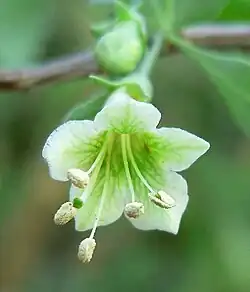 This shrub grows 1–3 metres (3 ft 3 in – 9 ft 10 in) tall. It is a dense tangle of spiny spreading or erect branches. It can form bushy thickets.[1] The leaves are pale, giving the plant its name.[2] The flowers are solitary or borne in pairs. They are funnel-shaped and "creamy-yellow to yellowish-green" or "greenish cream, sometimes tinged with purple".[2] They are fragrant and pollinated by insects.[2] The fruit is a juicy, oval-shaped, shiny red berry containing up to 50 seeds. The plant reproduces by seed and it can also spread via cuttings, and by suckering and layering.[1]