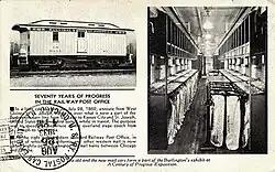 The first permanent Railway Post Office route was established on August 28, 1864, between Chicago, Illinois, and Clinton, Iowa.[5] This service is distinguished from the 1862 operation because mail was sorted to and received from each post office along the route, as well as major post offices beyond the route's end-points.