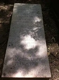 In 1942, on his way to visit his wife at the cottage where she was cared for by a devoted couple, Richardson crashed his motor-bike and was in hospital for several weeks. Kit was at that point mobile enough to visit him, but later in the year her condition worsened and in October she died. He was intensely lonely, though the camaraderie of naval life was some comfort.[70] In 1944 he married again. His second wife was the actress Meriel Forbes, a member of the Forbes-Robertson theatrical family.[70] The marriage brought him lifelong happiness and a son, Charles (1945–98), who became a television stage manager.[1]
