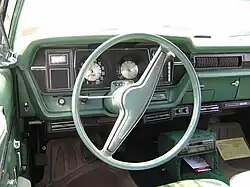 The interior of all body styles (including the radically different coupe) featured an all-new fully padded and safety-shaped dashboard with three squared pods for housing the instruments in front of the driver (indicator lights, fuel gauge, and water temperature to the left, 120 mph (190 km/h) speedometer at the center, and an electric clock or fuel economy gauge on the right) as well as a new horizontal radio/sound system design in the center of the dash. The traditional steering wheel horn pad since the 1970 Rebel was replaced with a rectangular "soft feel horn bar".[46]